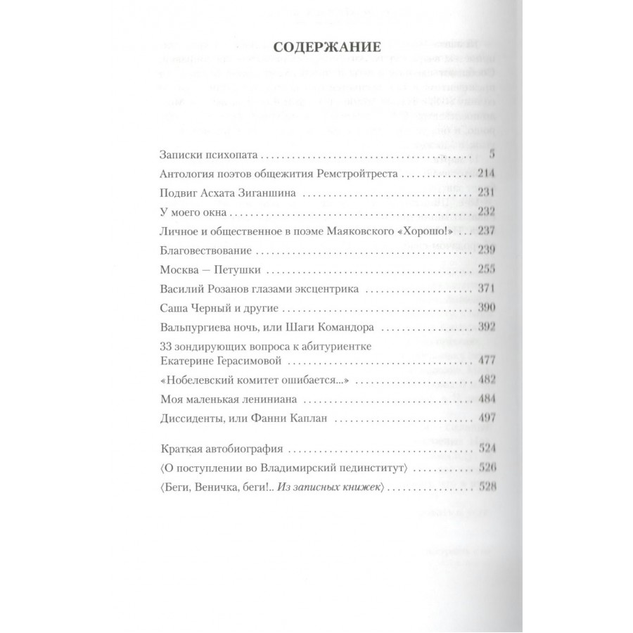 Сбоник произведений одного из культовых российских писателей ХХ века — Венедикта Ерофеева. Всемирную славу Венедикту Ерофееву принесла его знаменитая, переведенная более чем на тридцать языков поэма «Москва — Петушки». И хотя ее герой — Веничка — так и не увидел Красной площади, зато стал поистине народным, а сам автор теперь уже признан классиком русской литературы ХХ века. Однако творческое наследие Ерофеева — это не только поэма «Москва — Петушки»: это и «Записки психопата» (1956–1958), начатые в 17-летнем возрасте, и пьеса «Вальпургиева ночь» (часть задуманной автором, но неосуществленной трилогии под общим названием «Драй Нэхте»), и так называемые произведения малой прозы, включая сочинение, написанное на вступительных экзаменах в институт, и краткую автобиографию. Все это, а также фрагменты из записных книжек, которые Венедик Ерофеев вел с конца 1950-х годов, и небольшой текст — воспоминание о поступлении во Владимирский пединститут, вошло в настоящее издание, которое станет прекрасным подарком для поклонников писателя.