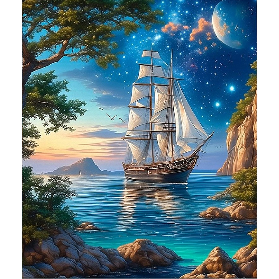 Мозаика алмазная холст на подрамнике 40х50 Пейзаж с парусником блестящая, полная выкладка, 30 цветов НД-1410 Рыжий кот