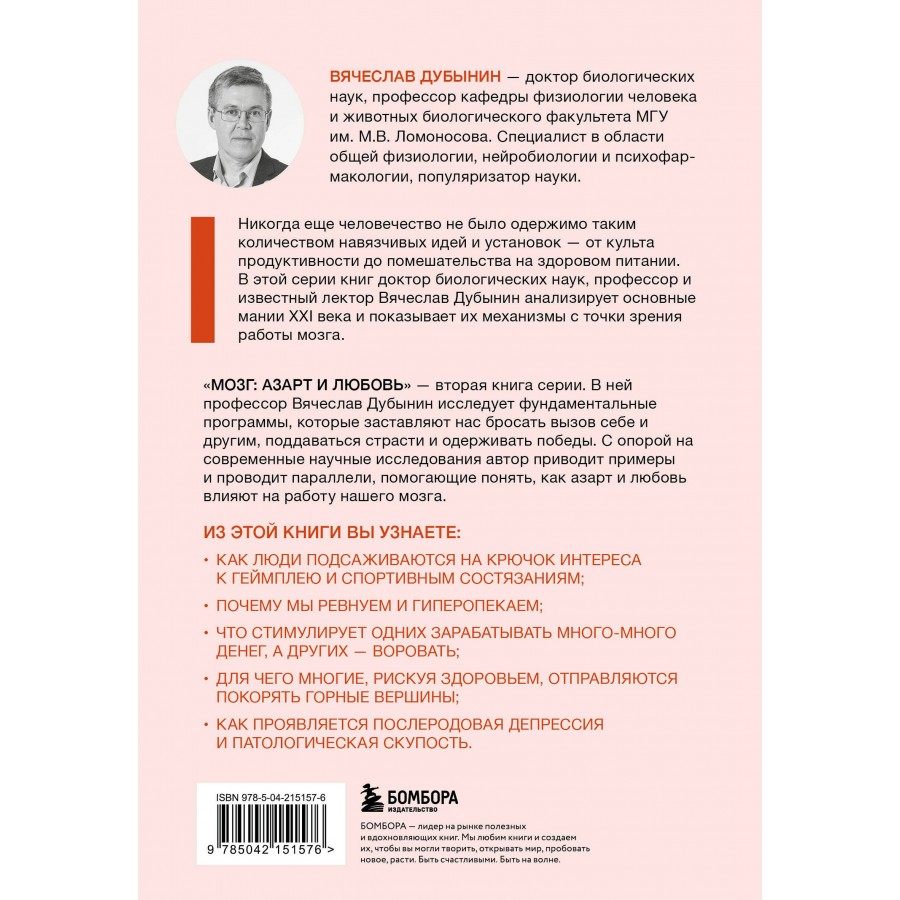 «МОЗГ: АЗАРТ И ЛЮБОВЬ» — вторая книга серии. В ней профессор Вячеслав Дубынин исследует фундаментальные программы, которые заставляют нас бросать вызов себе и другим, поддаваться страсти и одерживать победы. С опорой на современные научные исследования, автор приводит примеры и проводит параллели, помогающие понять, как азарт и любовь влияют на работу нашего мозга.