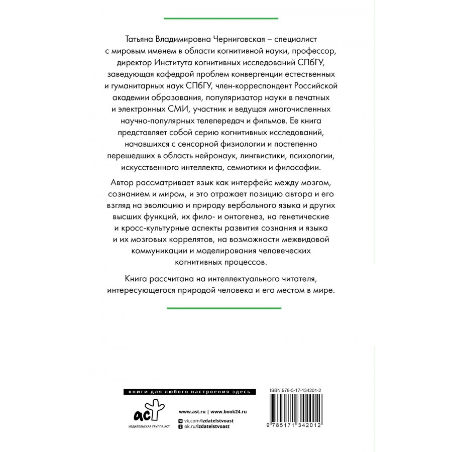 Татьяна Владимировна Черниговская - специалист с мировым именем в области когнитивной науки - профессор, Директор Института когнитивных исследований СПбГУ, заведующая кафедрой проблем конвергенции естественных и гуманитарных наук СПбГУ, член-корреспондент Российской академии образования. Популяризатор науки в печатных и электронных СМИ, участник и ведущая многочисленных научно-популярных телепередач и фильмов. Ее книга представляет собой серию когнитивных исследований, начавшихся с сенсорной физиологии и постепенно перешедших в область нейронаук, лингвистики, психологии, искусственного интеллекта, семиотики и философии.