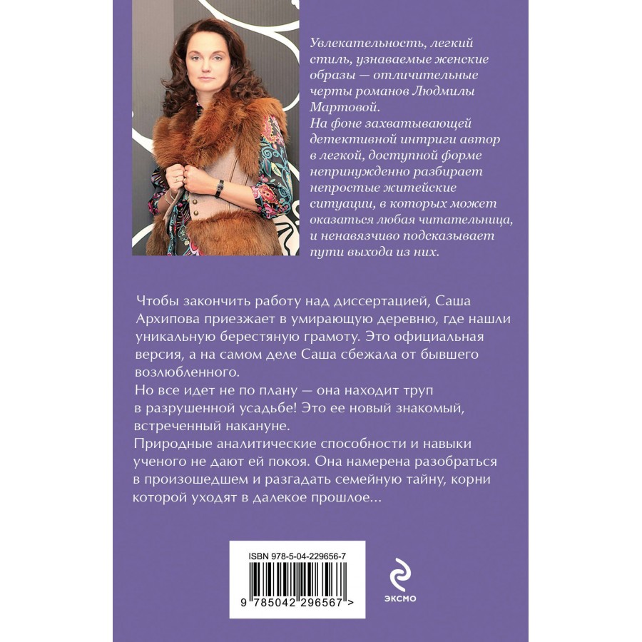 Чтобы закончить работу над диссертацией, Саша Архипова приезжает в умирающую деревню, где нашли уникальную берестяную грамоту. Это официальная версия, а на самом деле Саша сбежала от бывшего возлюбленного. Но все идет не по плану — она находит труп в разрушенной усадьбе! Это ее новый знакомый, встреченный накануне. Природные аналитические способности и навыки ученого не дают ей покоя. Она намерена разобраться в произошедшем и разгадать семейную тайну, корни которой уходят в далекое прошлое…