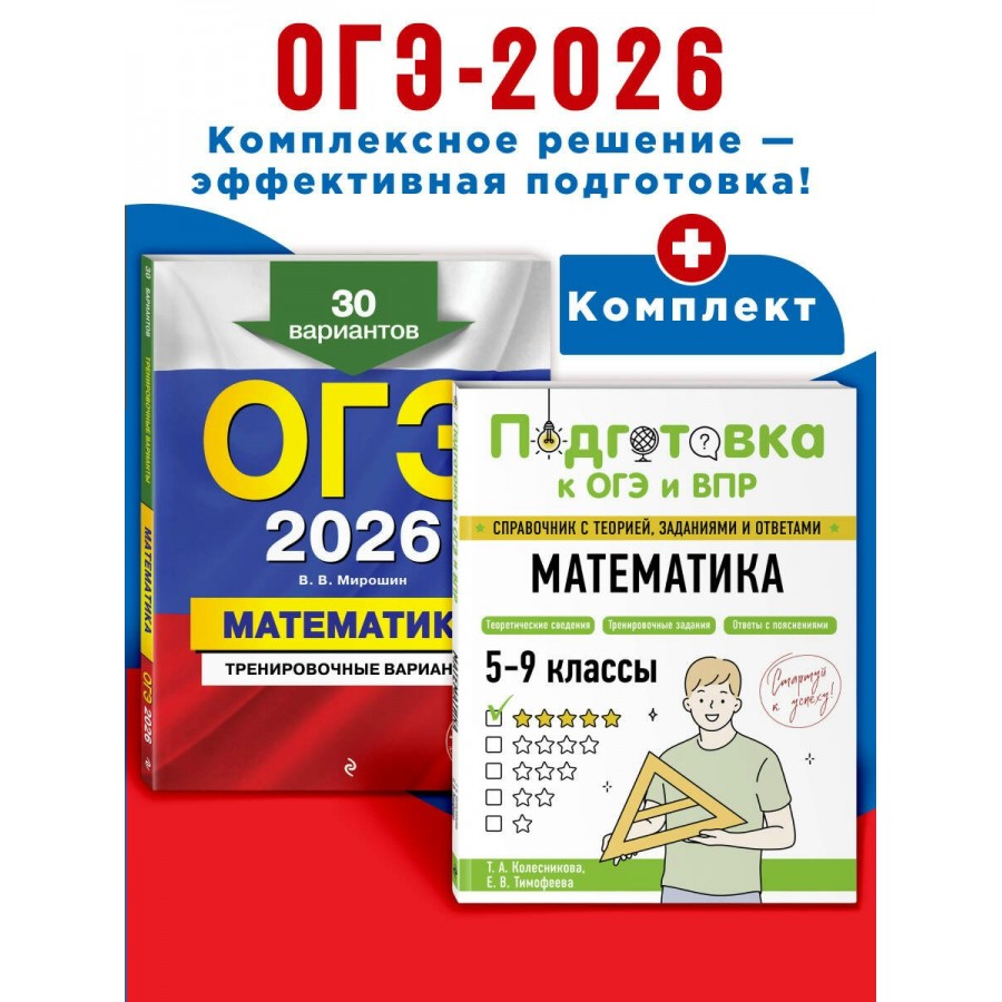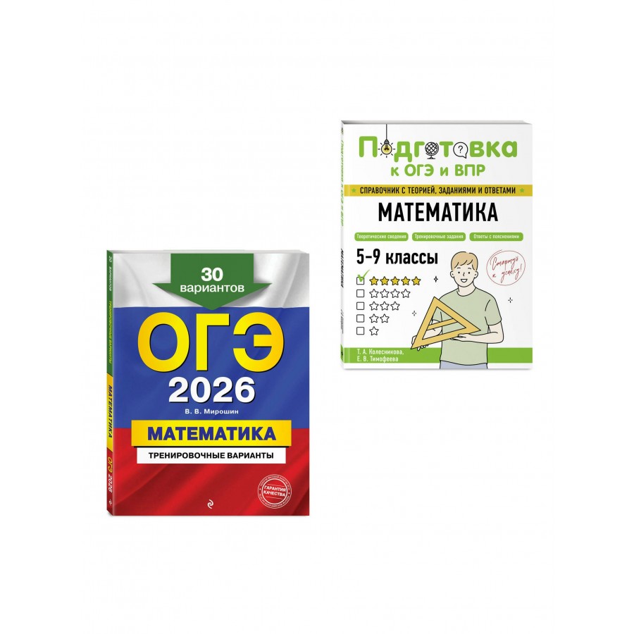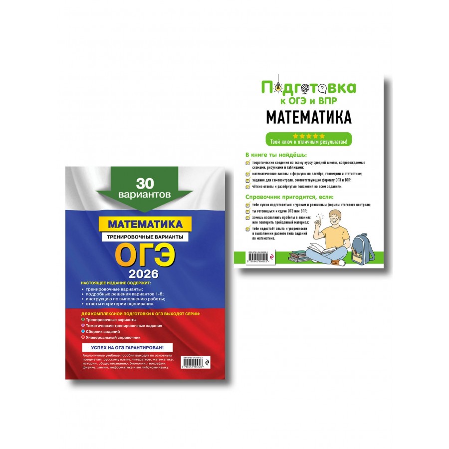 В комплект вошли книги: «ОГЭ-2026. Математика. Тренировочные варианты. 30 вариантов» и «Математика» из серии «Подготовка к ОГЭ и ВПР: справочник с теорией, заданиями и ответами», адресованные выпускникам средней школы для подготовки к ОГЭ по математике.