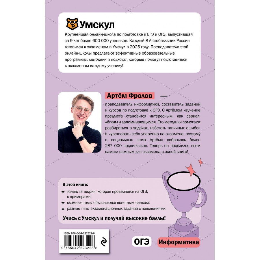 Эксклюзивный справочник от издательства «Эксмо» и топовой онлайн-школы «Умскул», выпустившей за 9 лет более 600 000 учеников, поможет каждому прийти к заветным баллам на ОГЭ 2026 по информатике. В книжке только самая актуальная и нужная для экзамена теория, а также разбор разных типов экзаменационных заданий!