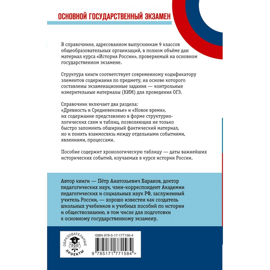 В справочнике, адресованном выпускникам 9 классов общеобразовательных организаций, в полном объёме дан материал курса "История России", проверяемый на основном государственном экзамене. Структура книги соответствует современному кодификатору элементов содержания по предмету, на основе которого составлены экзаменационные задания – контрольные измерительные материалы ОГЭ. Справочник включает два раздела: "Древность и Средневековье" и "Новое время", их содержание представлено в форме структурно-логических схем и таблиц, позволяющих не только быстро запомнить обширный фактический материал, но и понять взаимосвязь между отдельными событиями, явлениями, процессами.