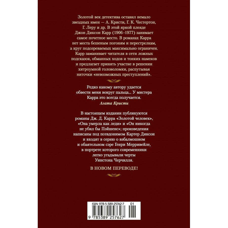 В настоящем издании публикуются романы Дж. Д. Карра «Золотой человек», «Она умерла как леди» и «Он никогда не убил бы Пэйшенс»; произведения написаны под псевдонимом Картер Диксон и входят в серию о взбалмошном и обаятельном сэре Генри Мерривейле, в портрете которого современники легко угадывали черты Уинстона Черчилля.