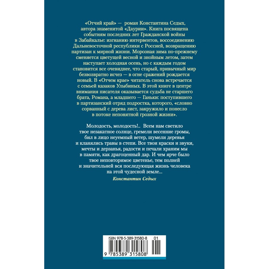 «Отчий край» — роман Константина Седых, автора знаменитой «Даурии». Книга посвящена событиям последних лет Гражданской войны в Забайкалье: изгнанию интервентов, воссоединению Дальневосточной республики с Россией, возвращению партизан к мирной жизни. Морозная зима по-прежнему сменяется цветущей весной и знойным летом, затем наступает холодная осень, но с каждым годом становится всё очевиднее, что старый, привычный мир безвозвратно исчез — в огне сражений рождается новый. В «Отчем крае» читатель снова встречается с семьей казаков Улыбиных. В этой книге в центре внимания писателя оказывается судьба не старшего брата, Романа, а младшего — Ганьки: поступившего в партизанский отряд подростка, которого, «словно сорванный с дерева лист, закружило и понесло в потоке непонятной грозной жизни».