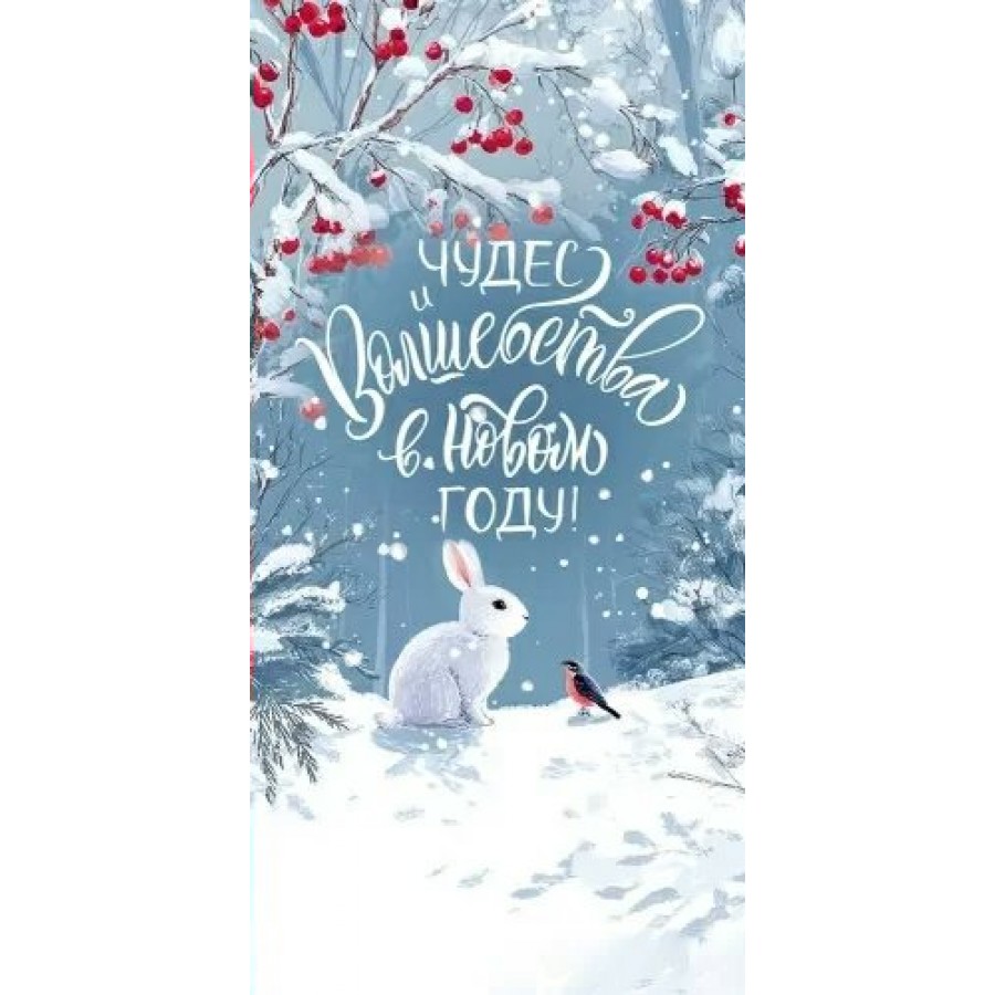 Поздравительный конверт для денег «Чудес и волшебства в Новом году» с очаровательным дизайном преобразит праздник. На изделии красочное изображение: под заснеженными рябиновыми ветками сидит белый кролик с маленькой птич... Читать далее...