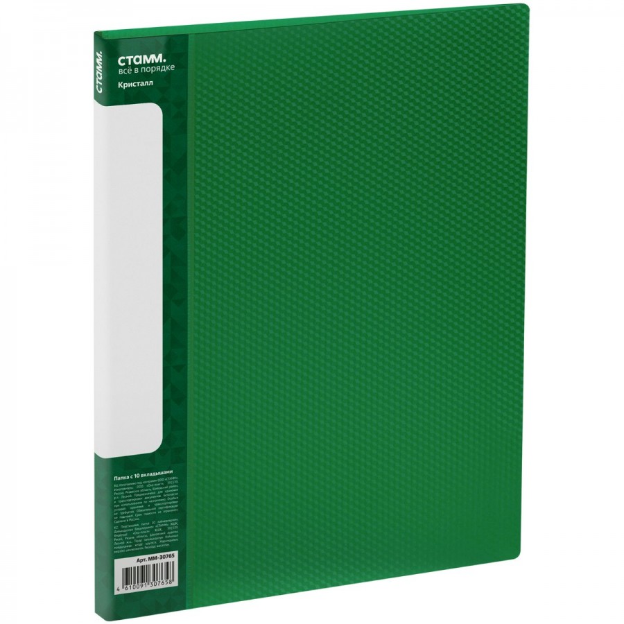 Папка с 10 вкладышами «СТАММ» серии «Кристалл» – отличный помощник для хранения бумаг формата А4. Изделие выполнено в полупрозрачном зеленом цвете. Внешняя сторона папки дополнена фактурным паттерном «Кристалл», сохраняю... Читать далее...
