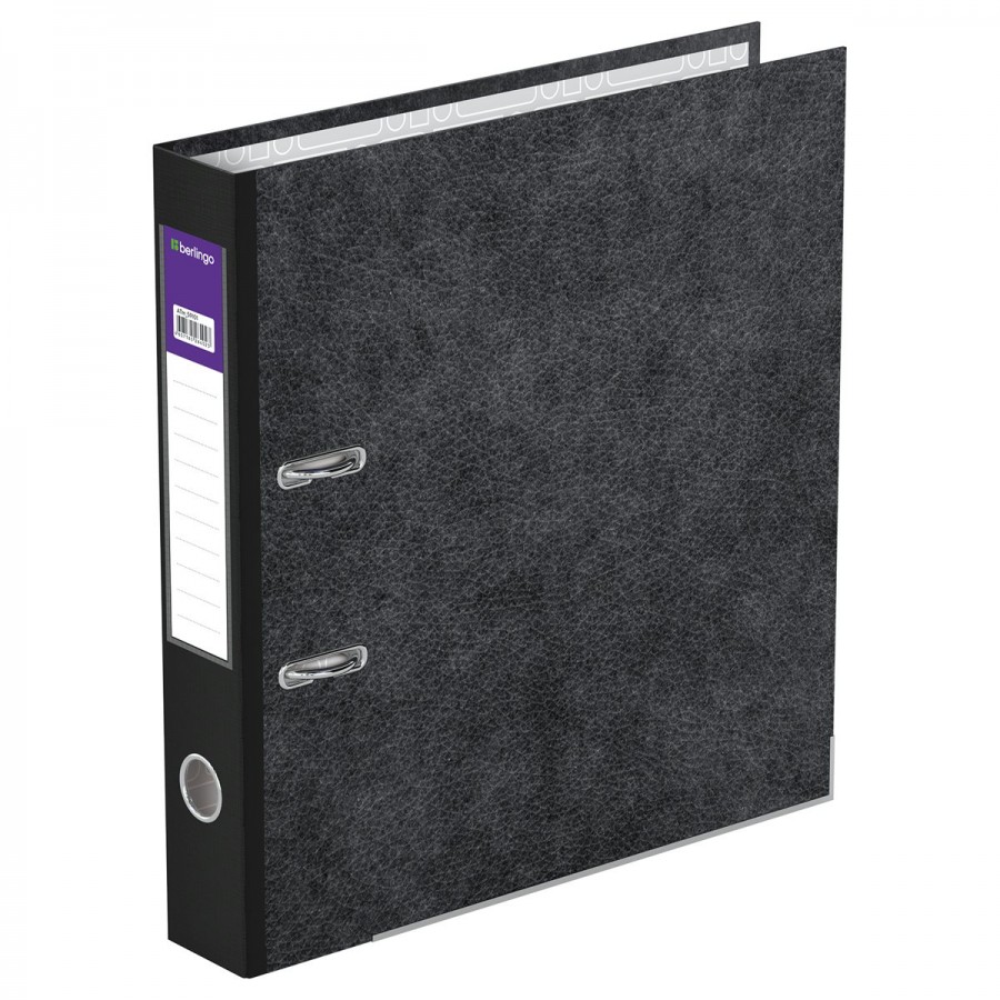 Папка–регистратор Berlingo серии Standard размером А4 (320*290*50 мм) с обложкой из жесткого износостойкого картона с покрытием из специальной ламинированной бумаги. Вместимость папки – 450 листов, ширина корешка – 50 мм, оснащена нижним металлическим кантом. Цвет – черный мрамор. Конструкция разработана с учетом всех особенностей эксплуатации. Папка выгодно отличается надежным арочным механизмом из качественного металла, наличием кармана на корешке со сменным информационным ярлыком для маркировки, полем для записей на внутренней стороне обложки и отверстием для удобного снятия с полки. Папка предназначена для транспортировки, упорядочивания и хранения бумаг.