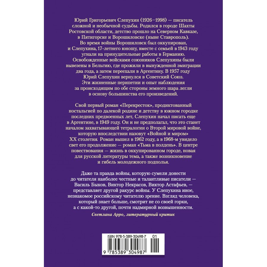 Свой первый роман «Перекресток», продиктованный ностальгией по далекой родине и детству в южном городке последних предвоенных лет, Слепухин начал писать еще в Аргентине, в 1949 году. Он и не предполагал, что это станет началом захватывающей тетралогии о Второй мировой войне, которую впоследствии назовут «Войной и миром» XX столетия. Роман вышел в 1962 году, а в 1968-м увидело свет его продолжение – роман «Тьма в полдень». В центре повествования – жизнь в оккупированном городе, новая для русской литературы тема, а также возникновение и гибель молодежного подполья, показанная с нестандартных позиций.