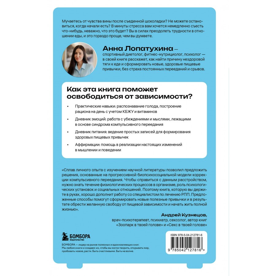 В книге Анна Лопатухина расскажет, почему мы «заедаем» эмоции, как остановить череду срывов и услышать истинные потребности своего тела. Вы найдете упражнения для контроля эмоций, дневники питания от эксперта, стратегии по корректировке пищевого поведения, техники работы с убеждениями и многое другое!