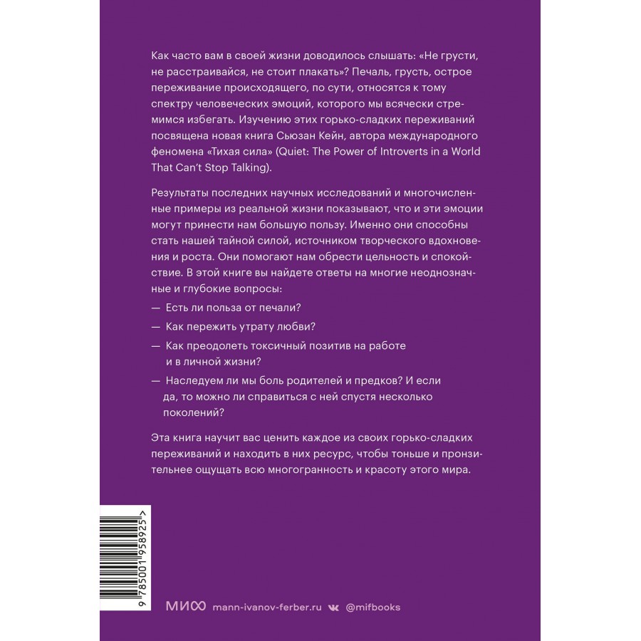 Печаль, грусть, боль — чувства, которых мы часто стараемся избегать. Но Сьюзан Кейн уверена: именно они способны стать нашей тайной силой. Эта пронзительная и глубокая книга поможет принять и прожить эмоции. Она возвращает читателю право на сложные негативные чувства и снимает с них стигму, а также поможет пережить непростые времена и придаст сил.