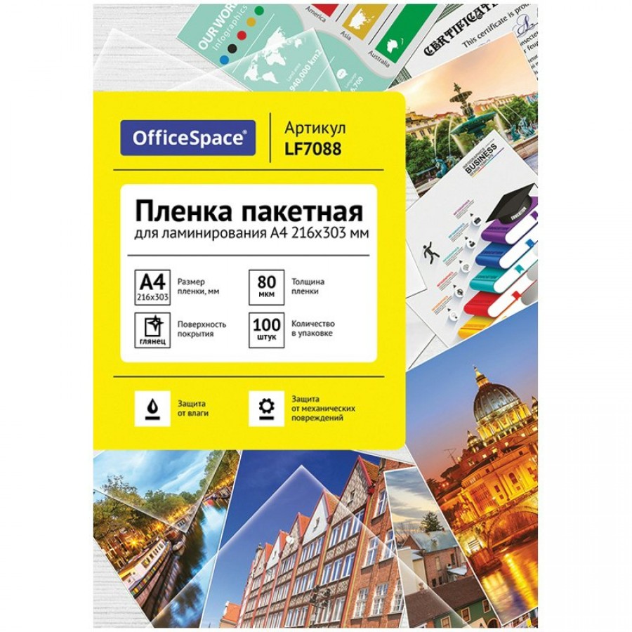 Пленка для ламинирования А4 216х303мм 80мкм 100шт глянцевая LF7088 OfficeSpace 222552