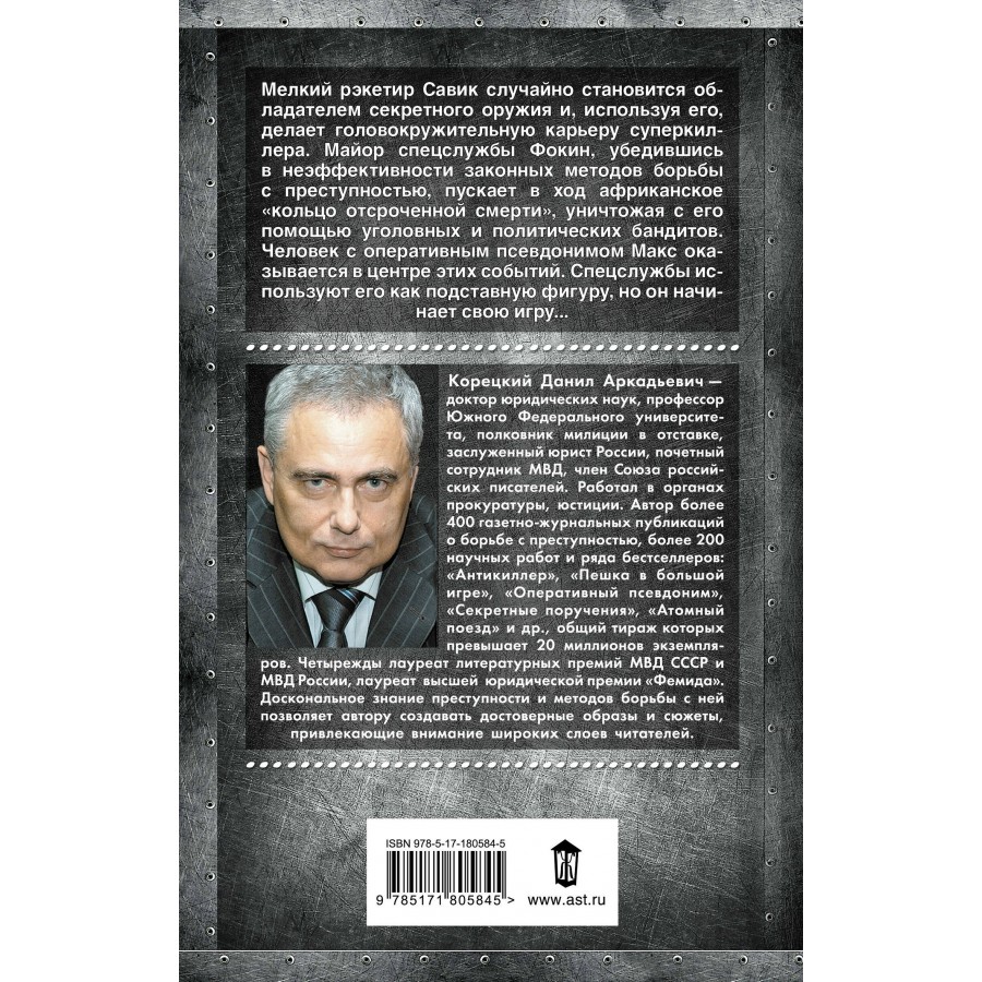 Мелкий рэкетир Савик случайно становится обладателем секретного оружия для тайных убийств и, используя его, делает головокружительную карьеру суперкиллера. Майор спецслужбы Фокин, убедившись в неэффективности законных методов борьбы с преступностью, пускает в ход вещественное доказательство ~- африканское "кольцо отсроченной смерти", уничтожая с его помощью уголовных и политических бандитов. В центре событий знакомый читателям по роману "Оперативный псевдоним" Макс Карданов, который используется спецслужбами как подставная фигура, но неожиданно начинает самостоятельную игру, перехитрив в конечном счете своих хозяев. Он успешно выполняет особые задания, противостоит бандитам, ищет бриллианты на огромную сумму и пытается выяснить тайну своего настоящего имени.