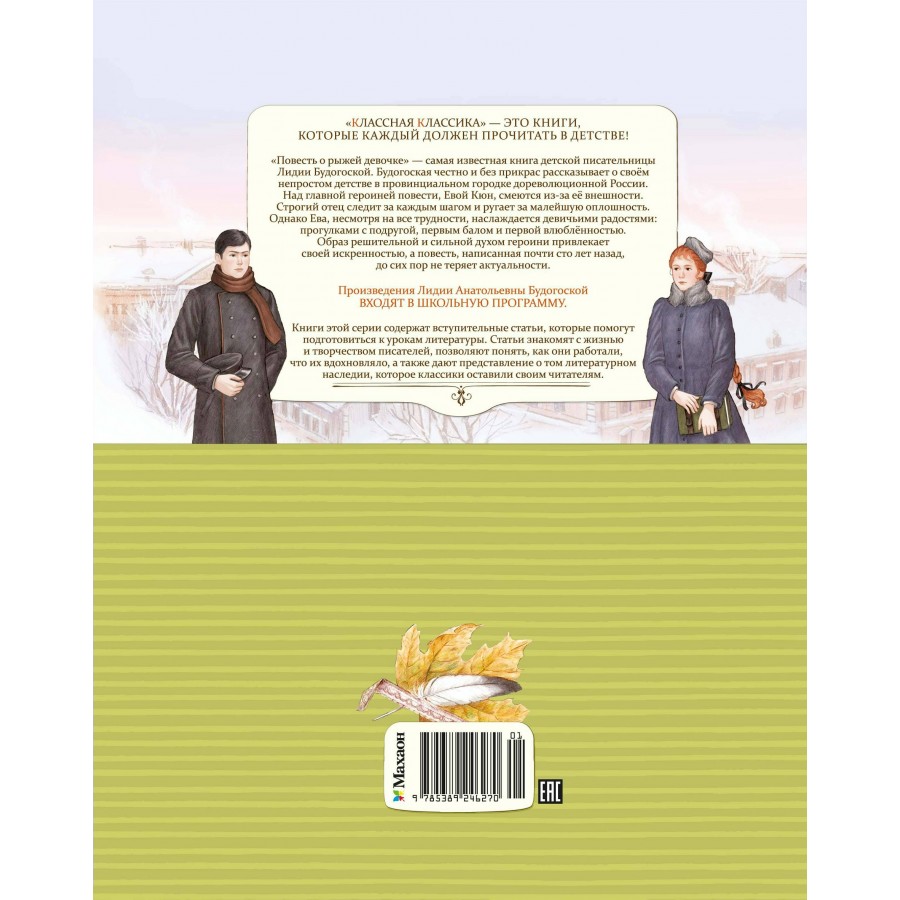 «Повесть о рыжей девочке» – самая известная книга детской писательницы Лидии Будогоской. Будогоская честно и без прикрас рассказывает о своём непростом детстве в провинциальном городке дореволюционной России. Над главной героиней повести, Евой Кюн, смеются из-за её внешности. Строгий отец следит за каждым шагом и ругает за малейшую оплошность. Однако Ева, несмотря на все трудности, наслаждается девичьими радостями: прогулками с подругой, первым балом и первой влюблённостью. Образ решительной и сильной духом героини привлекает своей искренностью, а повесть, написанная почти сто лет назад, до сих пор не теряет актуальности.