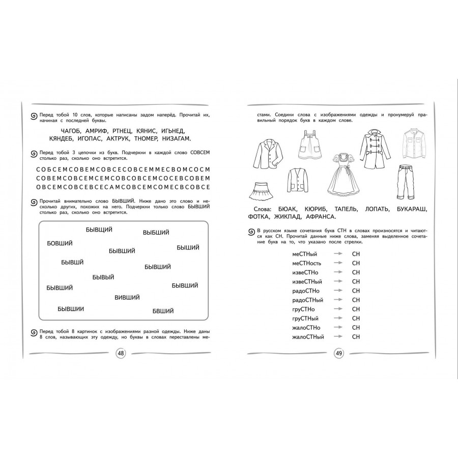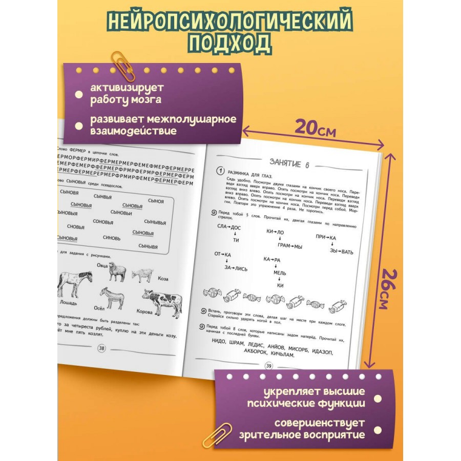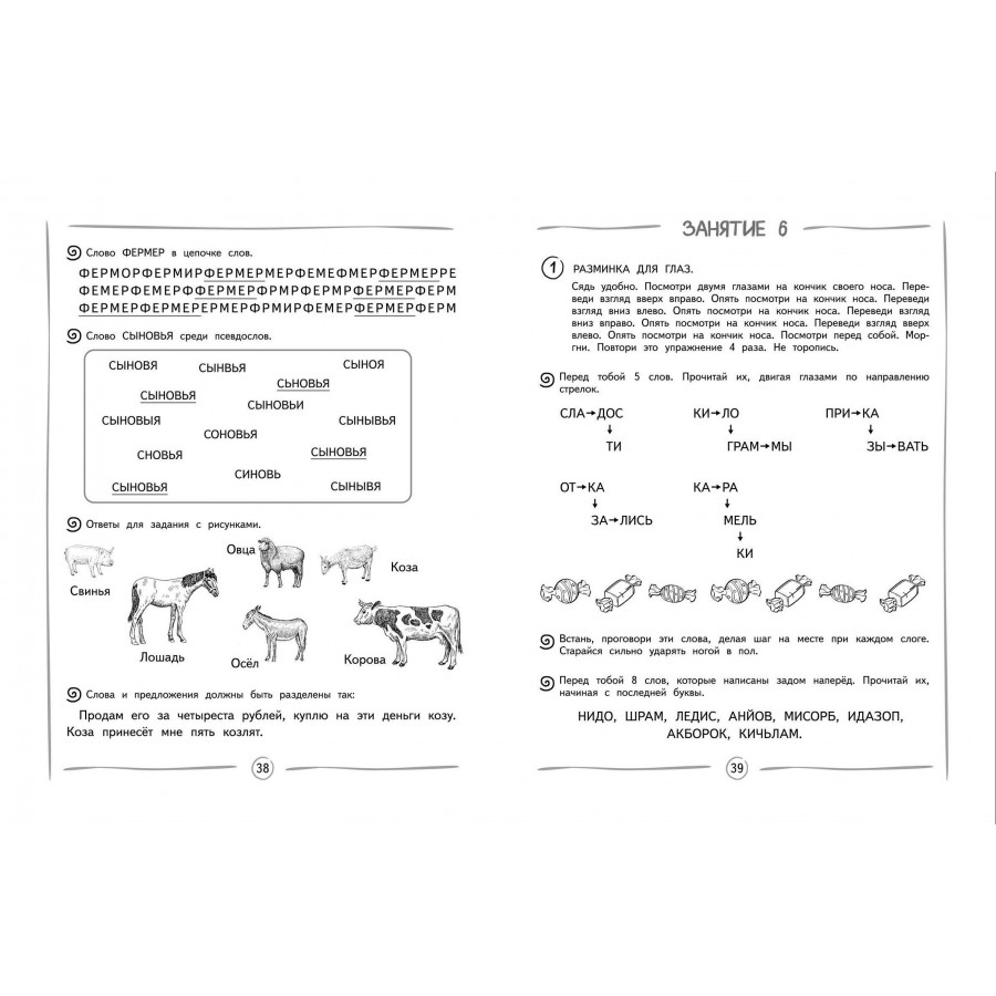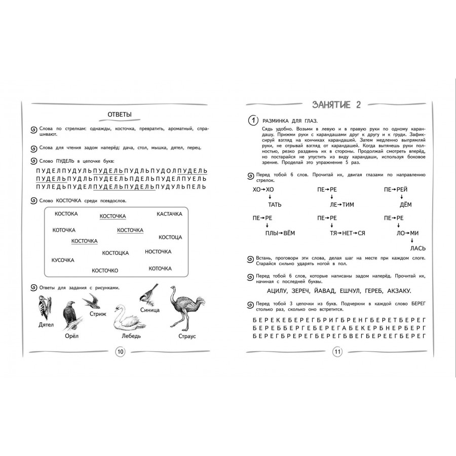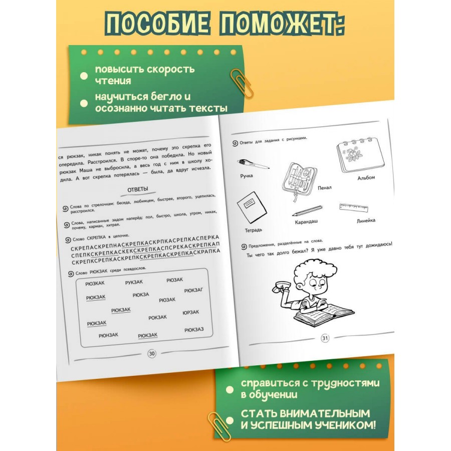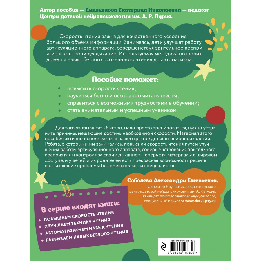 Книга издательства «Эксмо» подготовлена педагогом-практиком с целью увеличения скорости чтения и глубины понимания прочитанного. Нейропсихологический подход, используемый в пособии, способствует более эффективному обучению чтению и активизации работы мозга. Тренажер включает в себя 8 занятий по 13-14 заданий в каждом. В конце занятий имеются ответы для самопроверки. Выполняя увлекательные задания, ребенок будет искать слова в цепочках из букв; находить правильно написанное слово; читать словесные пирамидки, стихотворения, сказки по ролям разными голосами. Использование пособия с нестандартными игровыми заданиями в учебном процессе или в качестве дополнительного материала позволит ребенку повысить успеваемость, своевременно устранить возможные трудности в усвоении школьного материала без привлечения специалистов. Комплекс представленных в пособии упражнений способствует полноценному формированию высших психических функций, развитию межполушарного взаимодействия, что необходимо для успешного обучения в школе и нормального психоэмоционального развития ребёнка.