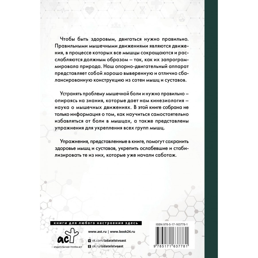 Устранять проблему мышечной боли и нужно правильно — опираясь на знания, которые дает нам кинезиология — наука о мышечных движениях. В этой книге собрана не только информация о том, как научиться самостоятельно избавляться от боли в мышцах, а также представлены упражнения для укрепления всех групп мышц.