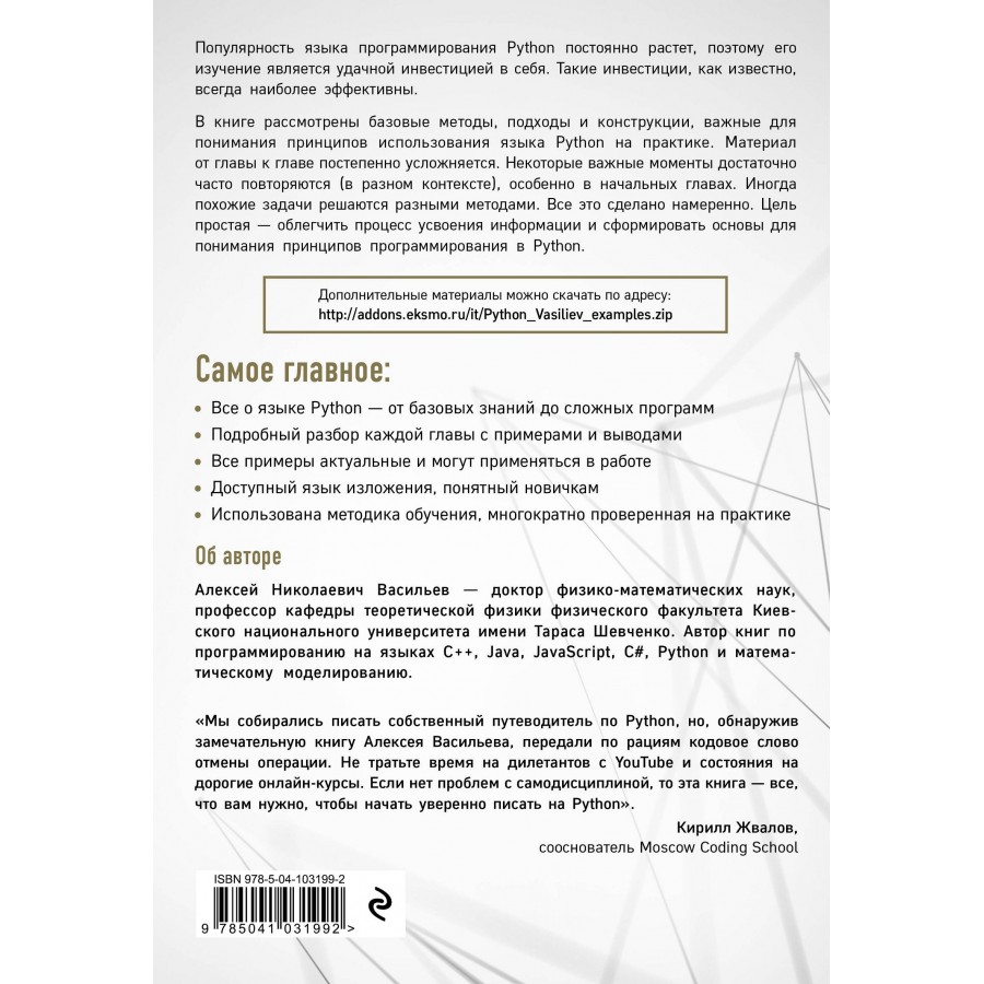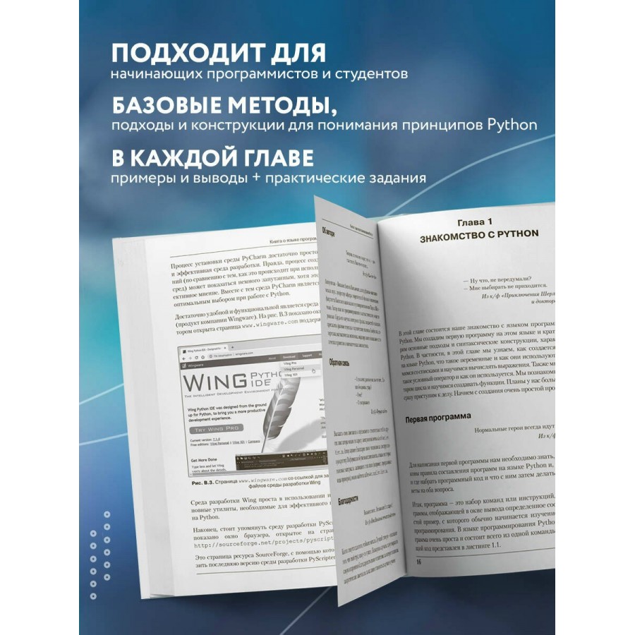 В книге рассмотрены базовые методы, подходы и конструкции, важные для понимания принципов использования языка Python на практике. Материал от главы к главе постепенно усложняется. Некоторые важные моменты достаточно часто повторяются (в разном контексте), особенно в начальных главах. Иногда похожие задачи решаются разными методами. Все это сделано намеренно. Цель простая — облегчить процесс усвоения информации и сформировать основы для понимания принципов программирования в Python.