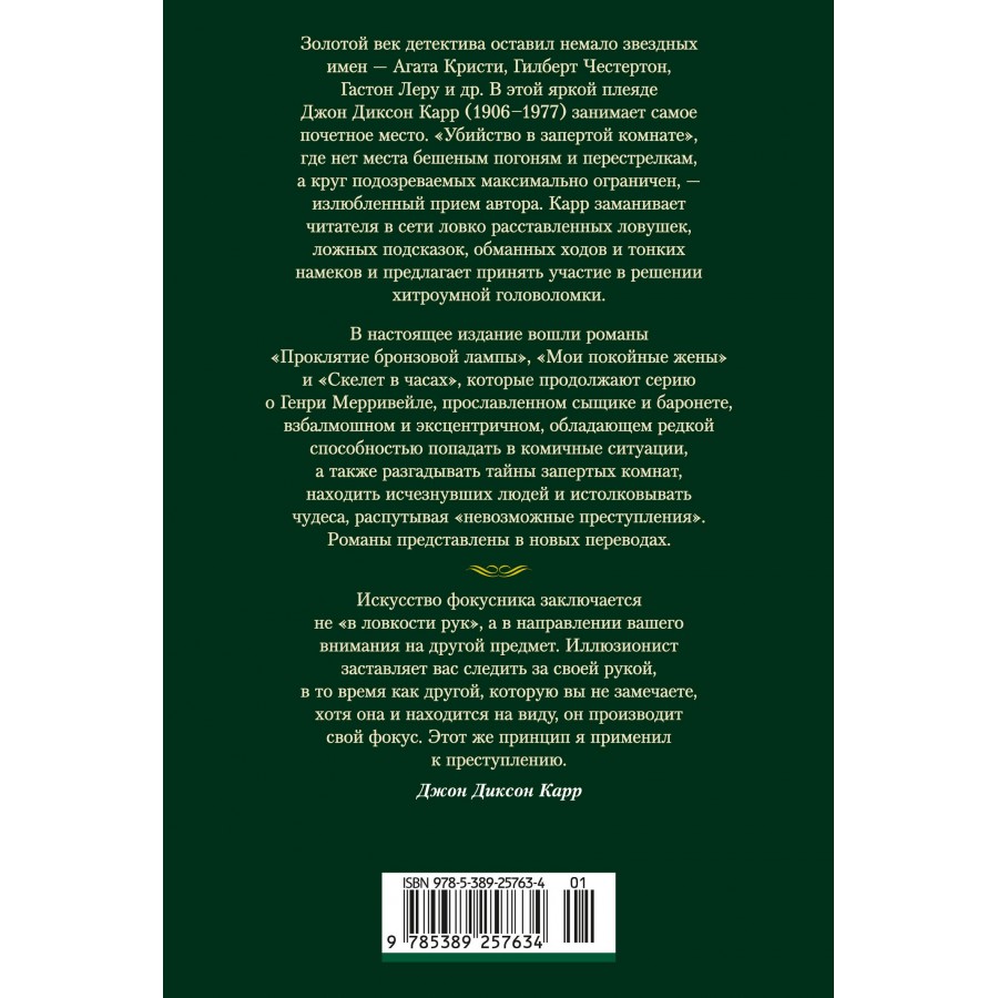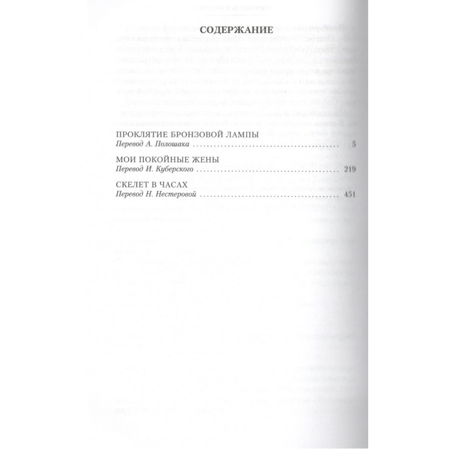 Джон Диксон Карр (1906–1977) – американский писатель, непревзойденный мастер детективного жанра, творчество которого пользуется заслуженной популярностью у поклонников этого жанра во всем мире. В настоящее издание вошли романы «Проклятие бронзовой лампы», «Мои покойные жены» и «Скелет в часах», которые продолжают серию о Генри Мерривейле, прославленном сыщике и баронете, взбалмошном и эксцентричном, обладающем редкой способностью попадать в комичные ситуации, а также разгадывать тайны запертых комнат, находить исчезнувших людей и истолковывать чудеса, распутывая «невозможные преступления».