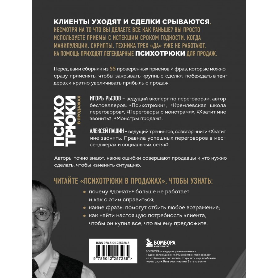 Авторы — Игорь Рызов, ведущий эксперт по переговорам, и Алексей Пашин, ведущий тренингов — точно знают, какие ошибки совершают продавцы и что нужно сделать, чтобы изменить ситуацию.