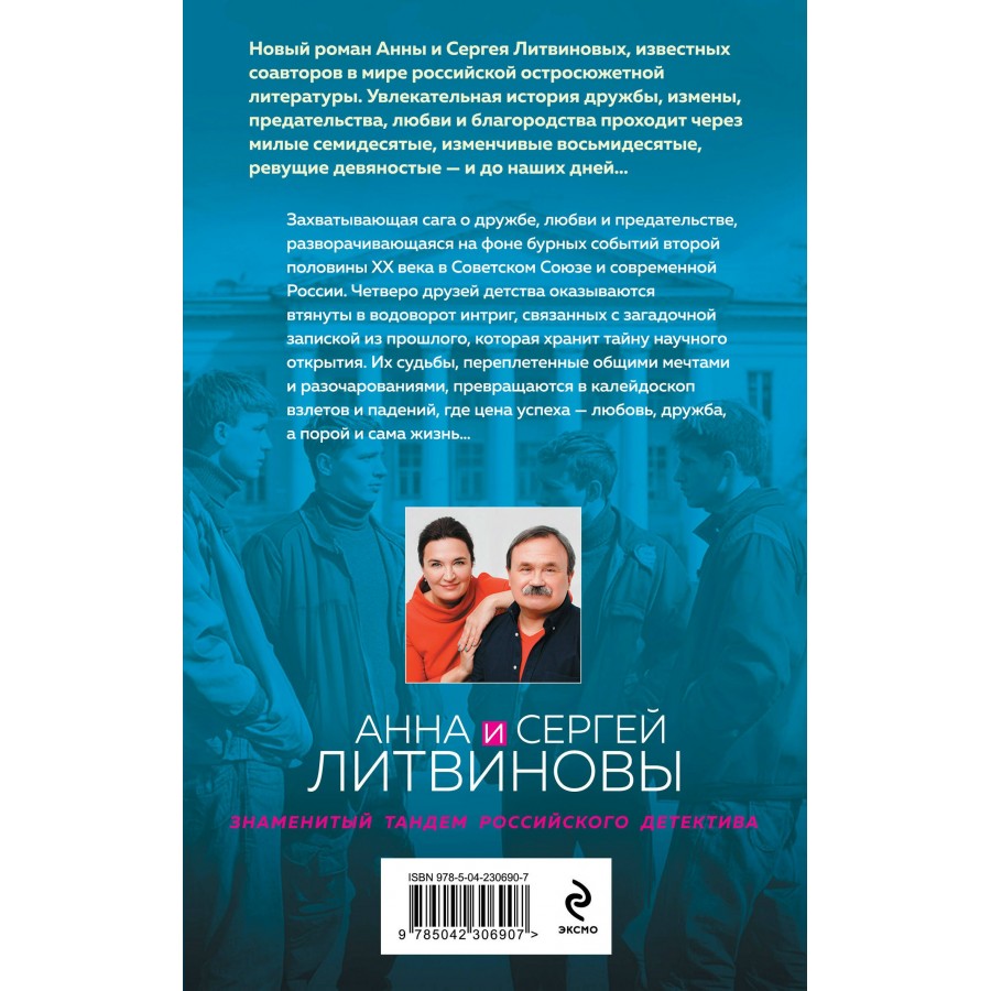 Новый роман Анны и Сергея Литвиновых, известных соавторов в мире российской остросюжетной литературы, займет достойное место среди их произведений. Увлекательная история дружбы, измены, предательства, любви и благородства проходит через милые семидесятые, изменчивые восьмидесятые, ревущие девяностые — и до наших дней…