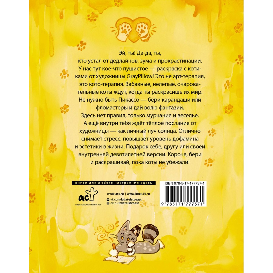 У нас тут кое-что пушистое — раскраска с котиками от художницы GrayPillow! Это не арт-терапия, это кото-терапия. Забавные, нелепые, очаровательные коты ждут, когда ты раскрасишь их жизнь. Не нужно быть Пикассо — бери карандаши или фломастеры и дай волю фантазии. Здесь нет правил, только мурчание и веселье.