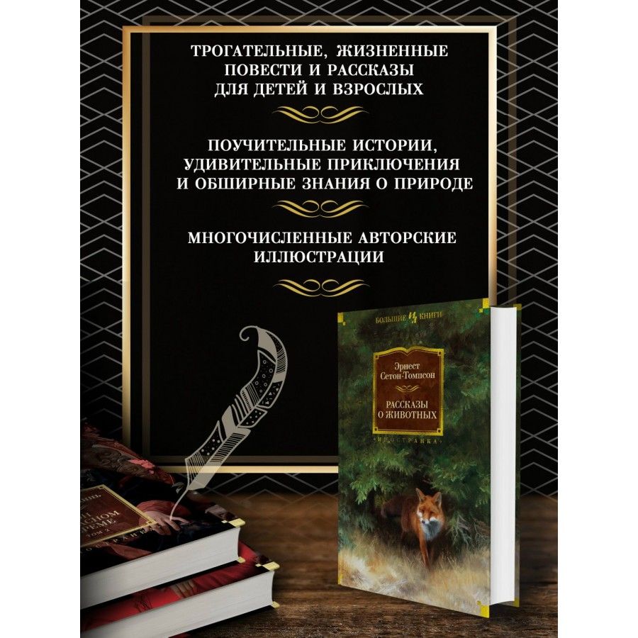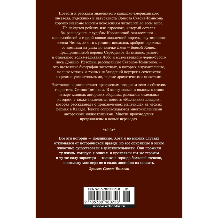 Повести и рассказы знаменитого канадско-американского писателя, художника и натуралиста Эрнеста Сетона-Томпсона хорошо знакомы многим поколениям читателей во всем мире. Не найдется ребенка или взрослого, который остался бы равнодушен к судьбам Королевской Аналостанки — жизнелюбивой и гордой кошки загадочной породы, неугомонного щенка Чинка, дикого мустанга-иноходца, храброго кролика со звездами на ушах по кличке Джек — Боевой Конек, предприимчивой вороны Серебряное Пятнышко, умного и отважного волка-великана Лобо и мужественного черно-бурого лиса Домино. Истории, рассказанные Сетоном-Томпсоном, — это настоящие биографии животных, в которых выразительные, полные метких и точных наблюдений портреты сочетаются с яркими, увлекательными, подчас драматичными сюжетами. Настоящее издание станет прекрасным подарком всем любителям творчества Сетона-Томпсона. В книгу вошли в полном составе четыре главных авторских сборника рассказов, отдельные истории, а также знаменитая повесть «Маленькие дикари», которая рассказывает о приключениях мальчишек на лесных фермах в Канаде. Тексты сопровождаются многочисленными авторскими иллюстрациями. Многие произведения представлены в новых переводах.
