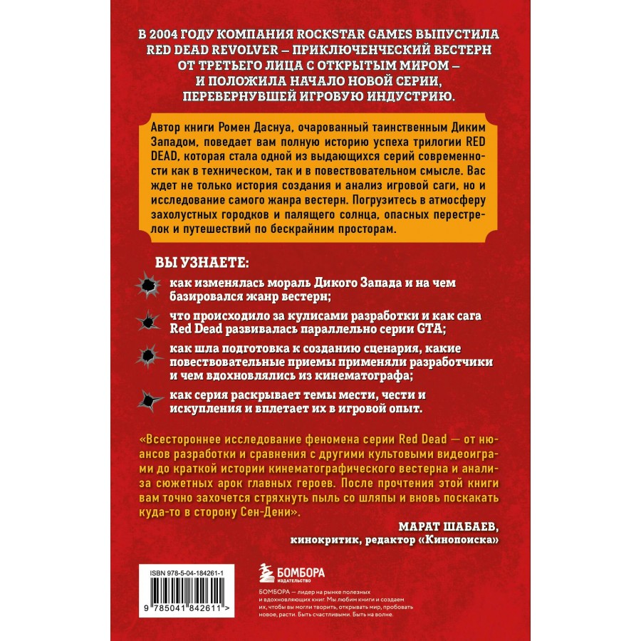 «Всестороннее исследование феномена серии Red Dead — от нюансов разработки и сравнения с другими культовыми видеоиграми до краткой истории кинематографического вестерна и анализа сюжетных арок главных героев. После прочтения этой книги вам точно захочется стряхнуть пыль со шляпы и вновь поскакать куда-то в сторону Сен-Дени». — Марат Шабаев, кинокритик, редактор Кинопоиска