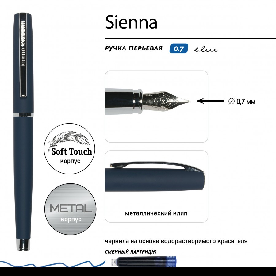 Cтильная перьевая ручка «SIENNA» от Bruno Visconti синего цвета с контрастирующими элементами в цвет серебра. Благодаря покрытию Soft Touch пальцы не скользят по корпусу ручки, письмо комфортное и легкое. Ручка оснащена ... Читать далее...