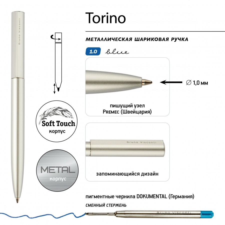 Torino – практичная шариковая автоматическая ручка от Bruno Visconti, заявляющая о своей индивидуальности. • пигментные чернила Dokumental от немецкого производителя • пишущий узел диаметром 1,0 мм Premec от швейцарского производителя • мягкое письмо • поворотный механизм подачи стержня • удобная конструкция металлического корпуса с оригинальным дизайнерским решением и покрытием Soft Touch.