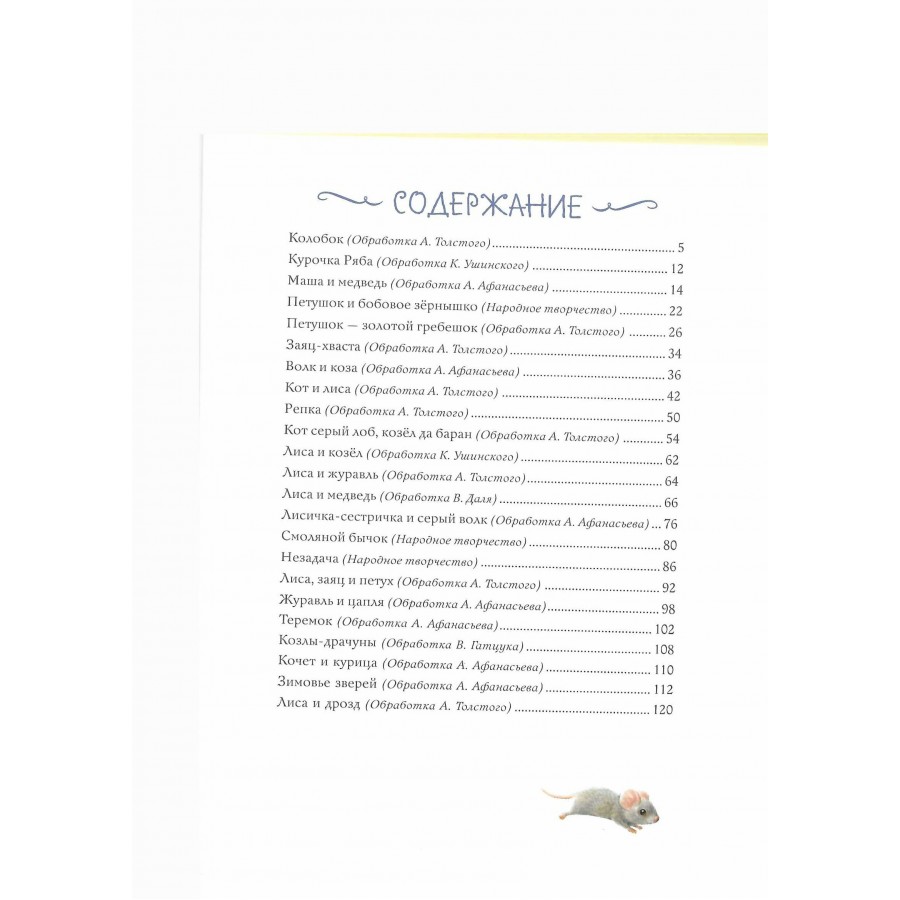 В сборник вошли 23 русские народные сказки о животных, любимые многими поколениями читателей. Среди них самые известные: «Курочка Ряба», «Репка», «Колобок», «Зимовье зверей», «Петушок — золотой гребешок», «Лисичка-сестричка и серый волк» и многие другие. Тексты напечатаны в обработке классиков, писателей и фольклористов Алексея Толстого, Константина Ушинского, Александра Афанасьева, Владимира Гатцука.