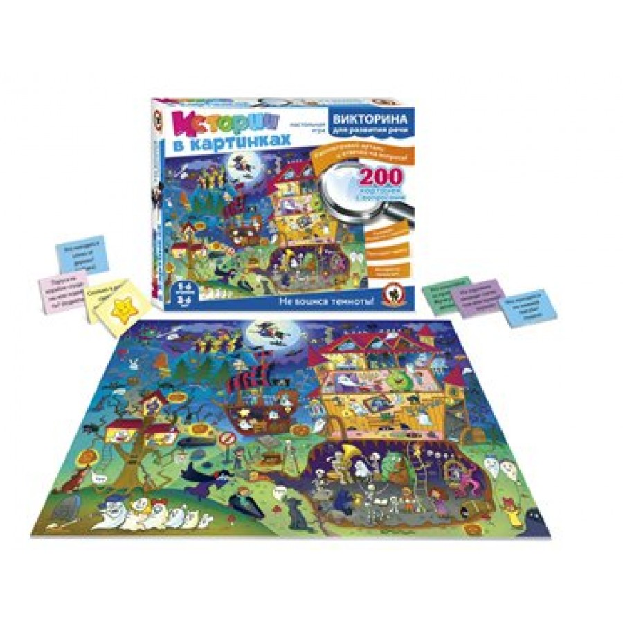 Все малыши любят рассматривать красивые яркие картинки, особенно, если они рассказывают весёлые истории. Наша серия викторин «Истории в картинках» – это не просто рисунки для развлечения, а увлекательная развивающая игра с простыми правилами, которая поможет малышам получить больше знаний об окружающем мире, цветах и признаках, пополнить словарный запас, развить речь, внимательность, память, навыки порядкового счёта, сравнения чисел и быстроту реакции, научит ориентироваться в пространстве и находить причинно-следственные связи. На игровом поле изображена волшебная поляна, гора с танцующими колдуньями, замок, пиратский корабль и дом с привидениями и забавными скелетиками. Все персонажи очень добрые и веселые. Малыши с удовольствием будут разглядывать веселые картинки. В комплекте 200 разноплановых вопросов с ответами для всестороннего развития малышей. В процессе игры взрослый зачитывает вопрос, а малышам необходимо найти на игровом поле нарисованный ответ. Кто быстрее всех нашел правильный ответ, получает призовую карточку со звездочкой. Выигрывает игрок, набравший наибольшее количество звездочек.