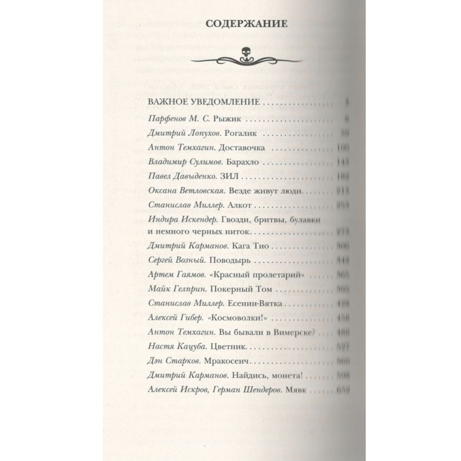 Под обложкой главной хоррор-антологии страны нынче собрано два десятка рассказов — отменных, пугающих до дрожи и очень-очень разных. Про исполняющий желания холодильник ЗИЛ. Про таинственный город, живущий собственной зловещей жизнью. Про поводырей, способных провести вас торной дорожкой да через Каленый мост прямиком в загробный мир. Про космонавтов, сталкивающихся с чудовищным инопланетным паразитом, и искусственный интеллект, принявший сторону Зла.