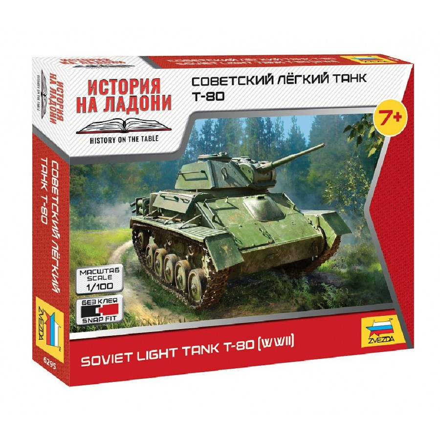 Танк Т-80 разработан летом – осенью 1942 года на базе Т-70. Двухместная башня, большой угол возвышения орудия для стрельбы по верхним этажам в городских боях, увеличенная мощность двигательной установки. Основным вооружением Т-80 являлась нарезная полуавтоматическая 45-мм танковая пушка обр. 1938 года. Всего было выпущено около 80 штук. Масштаб 1:100.