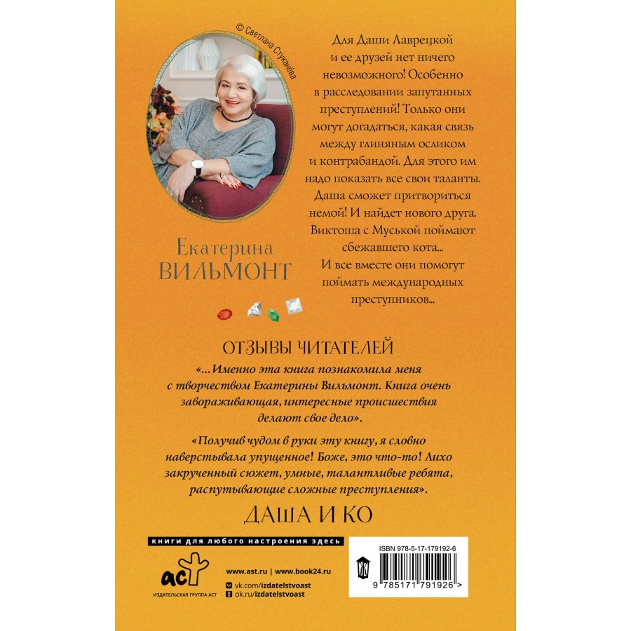 Для Даши Лаврецкой и ее друзей нет ничего невозможного! Особенно в расследовании запутанных преступлений! Только они могут догадаться, какая связь между глиняным осликом и контрабандой. Для этого им надо показать все свои таланты. Даша сможет притвориться немой! И найдет нового друга. Виктоша с Муськой поймают сбежавшего кота. И все вместе они помогут поймать международных преступников.