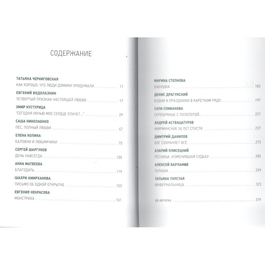 – В книге — тексты 17 авторов: Евгения Водолазкина, Татьяны Толстой, Эмира Кустурицы, Алексея Варламова, Дениса Драгунского, Дмитрия Данилова, Анны Матвеевой, Сергея Шаргунова, Шахри Амирхановой, Евгении Некрасовой, Андрея Аствацатурова, Елены Колиной, Саши Николаенко, Азария Плисецкого, Сати Спиваковой, Марины Степновой, Татьяны Черниговской.