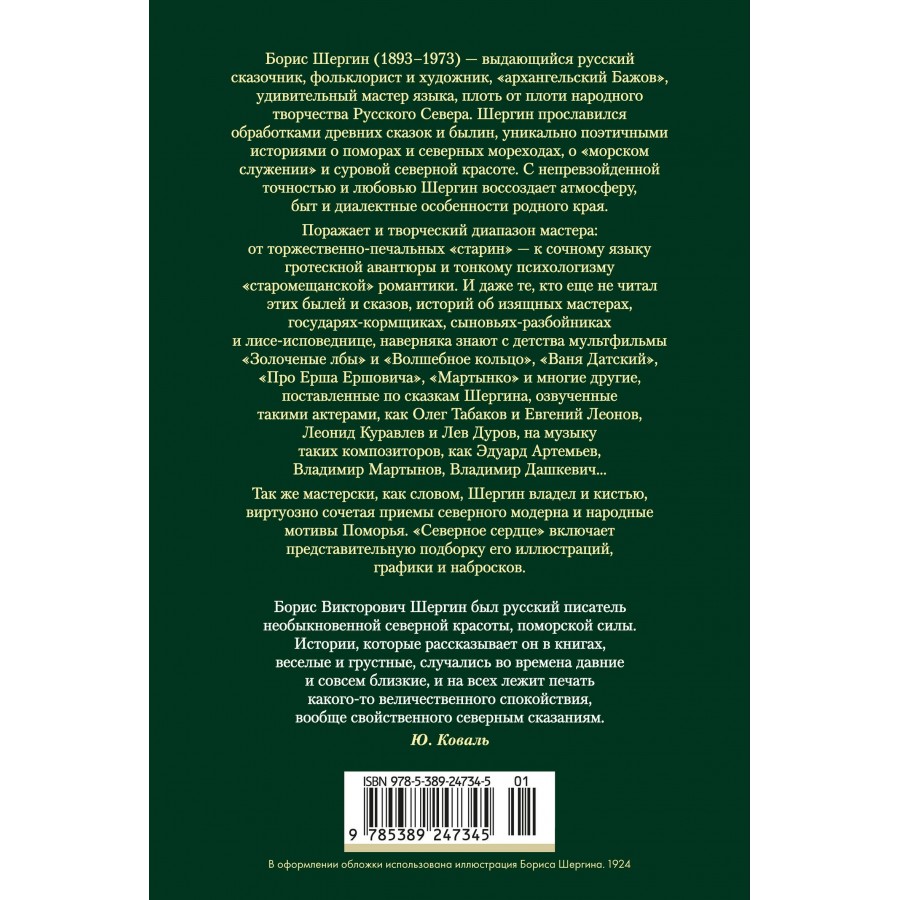 Борис Шергин (1893–1973) — выдающийся русский сказочник, фольклорист и художник, с непревзойденной точностью и любовью воссоздающий атмосферу, быт и диалектные особенности родного северного края. Также Шергин мастерски владел и кистью, виртуозно сочетая приемы северного модерна и народные мотивы Поморья. «Северное сердце» включает больную подборку его иллюстраций, графики и набросков, а также ряд фотографий.