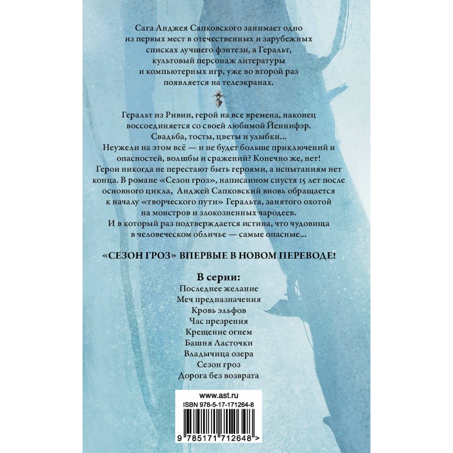 "Сезон гроз" – история о ведьмаке Геральте, написанная спустя почти 15 лет после окончания основного цикла, роман, действие в котором происходит между событиями последней и первой повести сборника "Последнее желание".