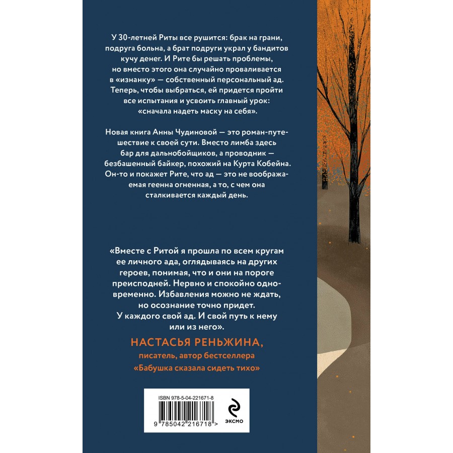 Новая книга Анны Чудиновой — это роман-путешествие к своей сути. Вместо Лимба здесь бар для дальнобойщиков, а проводник — безбашенный байкер, похожий на Курта Кобейна. Он-то и покажет Рите, что ад — это не воображаемая геенна огненная, а то, с чем она сталкивается каждый день.