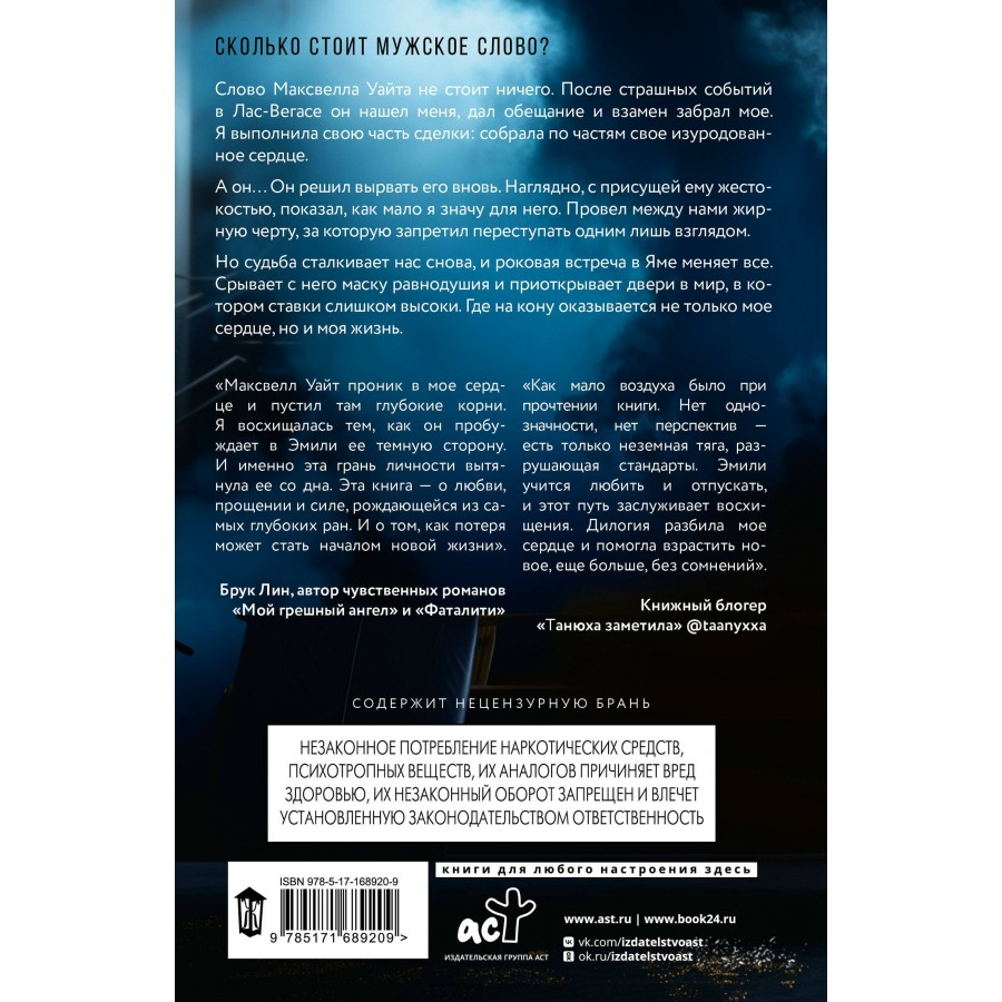 – «Максвелл Уайт проник в мое сердце и пустил там глубокие корни. Я восхищалась тем, как он пробуждает в Эмили ее темную сторону. И именно эта грань личности вытянула ее со дна. Эта книга — о любви, прощении и силе, рождающейся из самых глубоких ран. И о том, как потеря может стать началом новой жизни» — Брук Лин, автор чувственных романов «Мой грешный ангел» и «Фаталити».