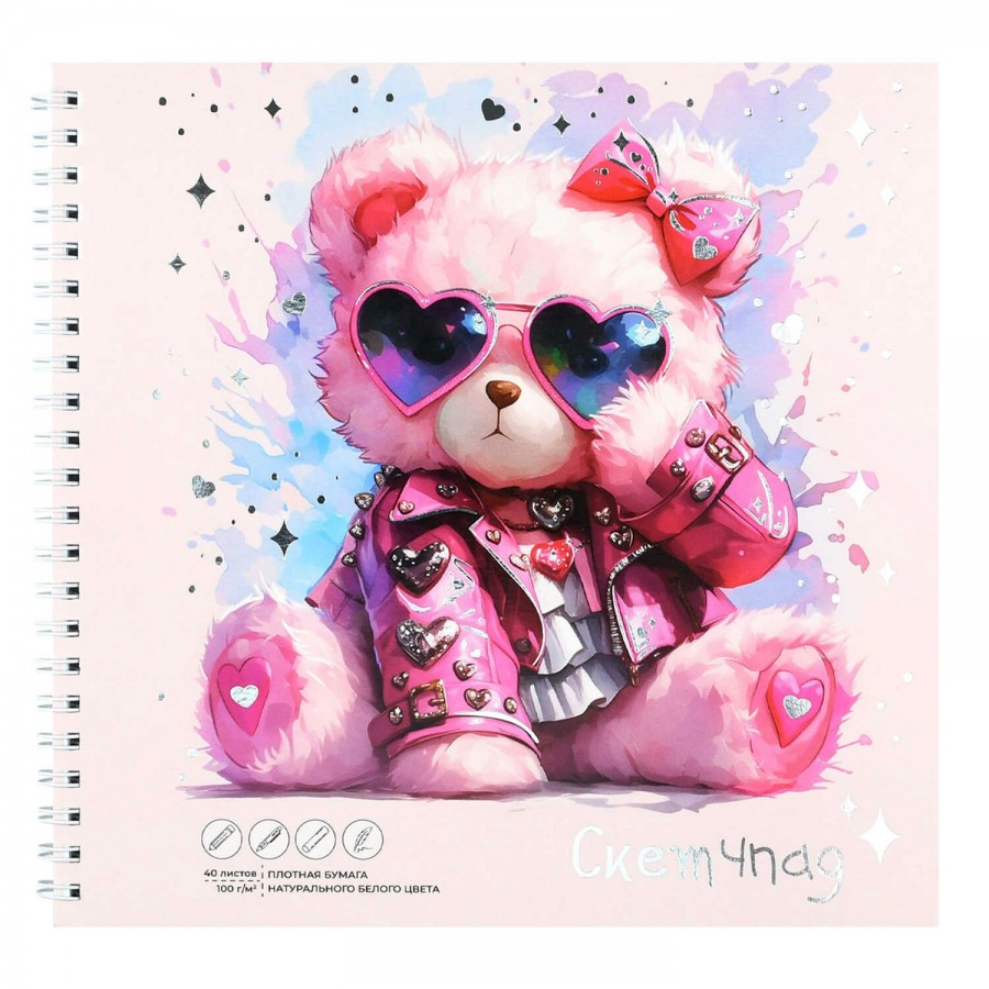 Альбом для рисования (Скетчпад) 195х195 мм, 40 л, блок - белый офсет 100 г/м2, арт. 72621 РОЗОВЫЙ МИШКА /обложка полноцветная печать, гребень по короткой стороне, тиснение фольгой/