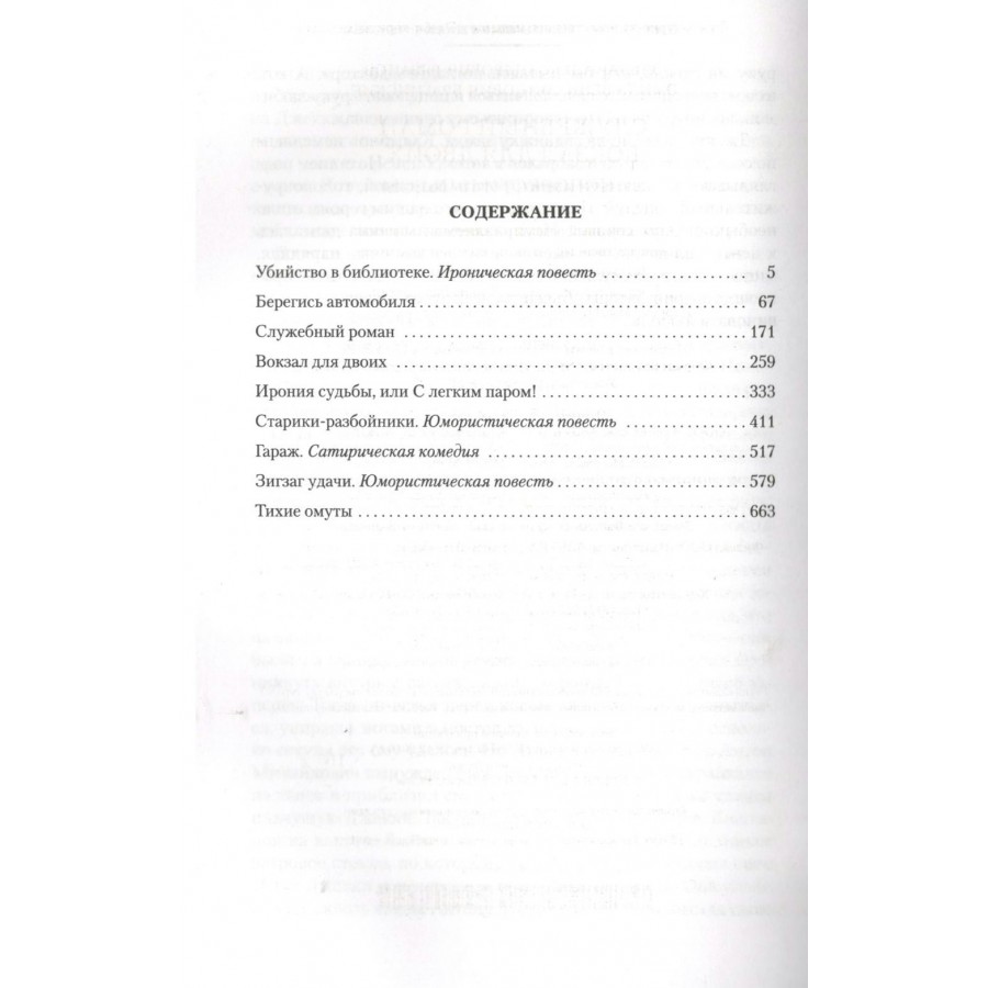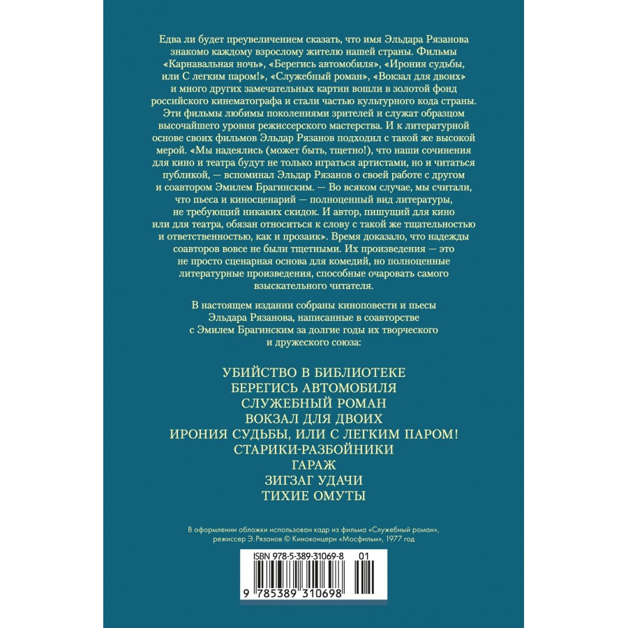 В настоящем издании собраны киноповести и пьесы Рязанова и Брагинского, созданные за долгие годы их творческого и дружеского союза: «Убийство в библиотеке», «Берегись автомобиля», «Служебный роман», «Вокзал для двоих», «Ирония судьбы, или С легким паром!», «Старики-разбойники», «Гараж», «Зигзаг удачи», «Тихие омуты».