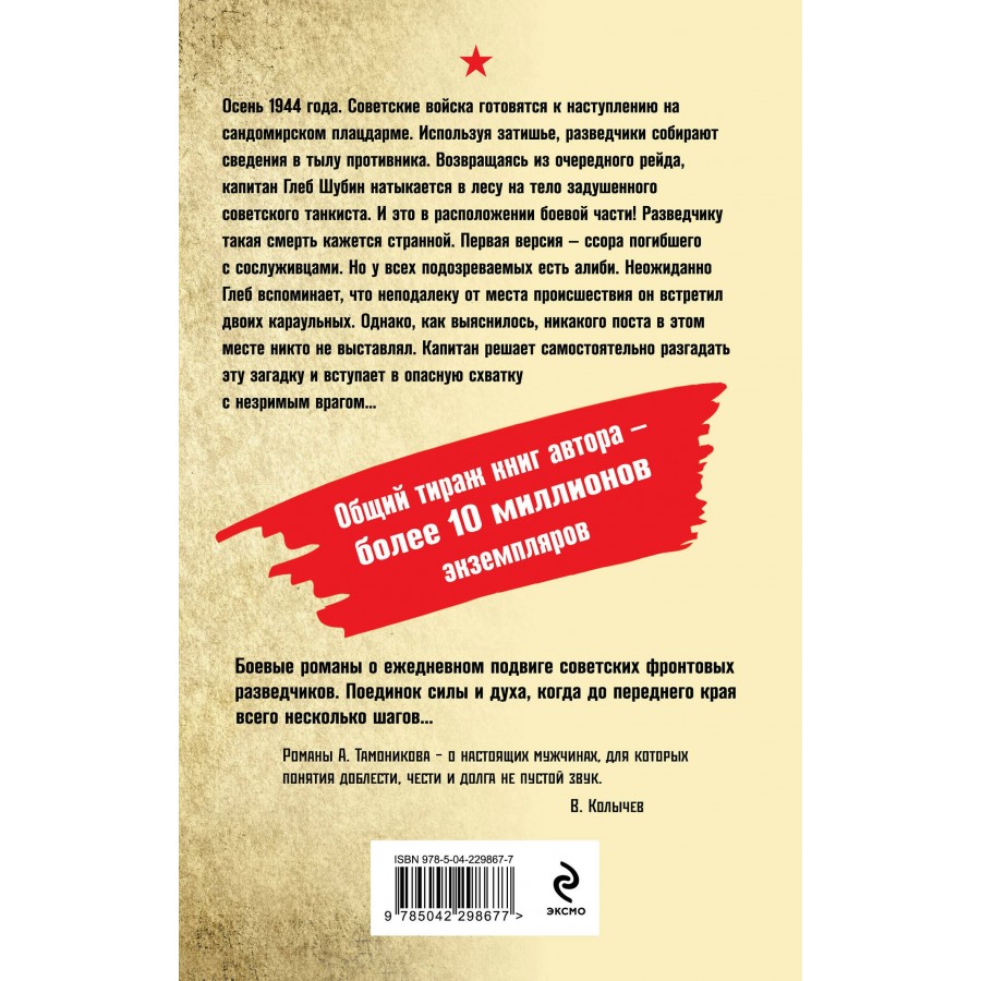 Осень 1944 года. Советские войска готовятся к наступлению на сандомирском плацдарме. Используя затишье, разведчики собирают сведения в тылу противника. Возвращаясь из очередного рейда, капитан Глеб Шубин натыкается в лесу на тело задушенного советского танкиста. И это в расположении боевой части! Разведчику такая смерть кажется странной. Первая версия — ссора погибшего с сослуживцами. Но у всех подозреваемых есть алиби. Неожиданно Глеб вспоминает, что неподалеку от места происшествия он встретил двоих караульных. Однако, как выяснилось, никакого поста в этом месте никто не выставлял. Капитан решает самостоятельно решить эту загадку и вступает в опасную схватку с незримым врагом…