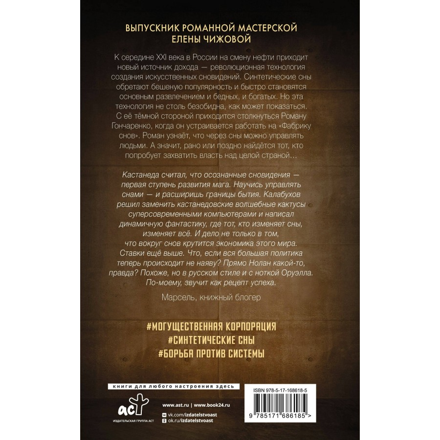 К середине XXI века в России на смену нефти приходит новый источник дохода — революционная технология создания искусственных сновидений. Синтетические сны обретают бешеную популярность и быстро становятся основным развле... Читать далее...