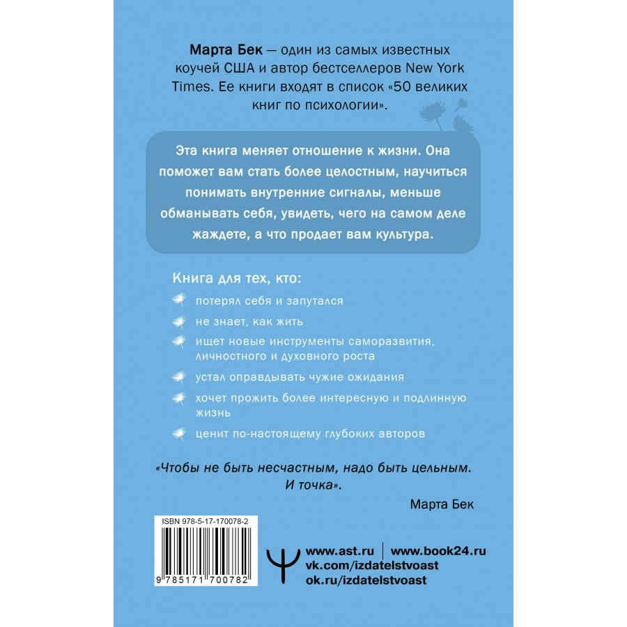 Марта Бек - один из самых известных коучей США и автор бестселлеров New York Times, ее книги входят в список "50 великих книг по психологии" - поможет вам стать более целостным, начать жить своей жизнью и перестать предавать себя.