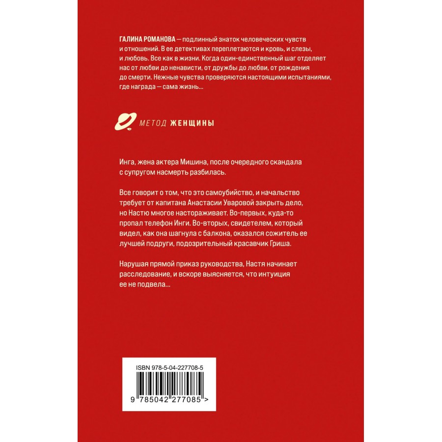 Галина Романова — подлинный знаток человеческих чувств и отношений. В ее детективных мелодрамах из серии «Метод женщины» переплетаются и кровь, и слезы, и любовь. Все, как в реальности, когда один-единственный шаг отделяет нас от любви до ненависти, от дружбы до любви, от рождения до смерти. Нежные чувства проверяются настоящими испытаниями, где награда — сама жизнь.
