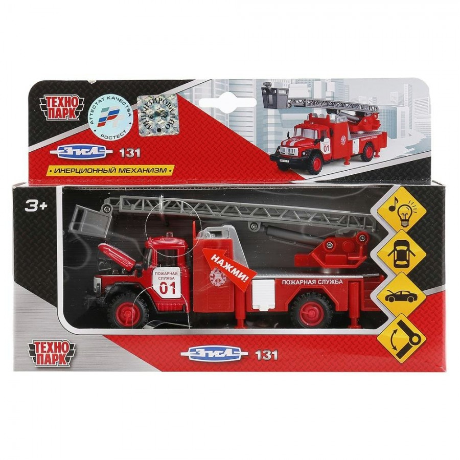 Инерционная машинка "ЗИЛ 131" представляет собой машину пожарной службы в масштабе 1:43. Изготовлена из металла с элементами пластика и может стать как хорошей игрушкой для ребенка, так и пополнить коллекцию металлических машинок. Эта пожарная машинка отличается большой точностью и качественной проработкой даже мелких деталей: ребенок сможет рассмотреть мотор машинки, изучить устройство крана и рисунок на шинах. У машинки открываются двери и капот, а также поднимается и опускается кран. Кроме того, для большей устойчивости во время тушения пожаров снизу машины имеются специальные подпорки.Благодаря инерционному механизму, машинка может ездить сама – с такой игрушкой можно придумать интересные сюжетные игры. Для большей реалистичности в нее установлены световые и звуковые модули: она может издавать сигналы, характерные для пожарных машин и включать фары. Развивает фантазию и мелкую моторику рук.Рекомендовано детям от 3-х лет. Работает при помощи 3 батареек типа LR 41 (AG 3) (входят в комплект).