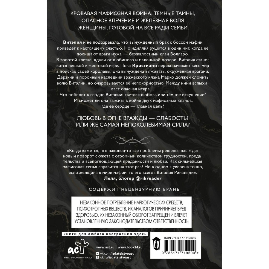 Витэлия и не подозревала, что вынужденный брак с боссом мафии приведет к настоящему счастью. Но идиллия рушится в один миг, когда её похищают враги мужа — безжалостный клан Волларо. В золотой клетке, вдали от любимого и маленькой дочери, Витэлия становится пешкой в жестокой игре. Пока Кристиано переворачивает весь мир в поисках своей королевы, она вынуждена выживать, окружённая врагами. Дерзкий и порочный наследник вражеского клана Марко должен сломить волю Витэлии, но очаровывается её непокорностью. Между ними вспыхивает опасная искра…