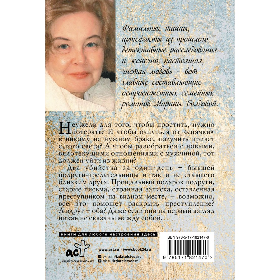 Неужели для того, чтобы простить, нужно потерять? И чтобы очнуться от "спячки" в никому не нужном браке, получить привет с того света? А чтобы разобраться с новыми, вялотекущими отношениями с мужчиной, тот должен уйти из жизни? Два убийства за один день – бывшей подруги-предательницы и так и не ставшего близким друга. Прощальный подарок подруги, старые письма, странная записка, оставленная преступником на видном месте, – возможно, все это поможет раскрыть преступление? А вдруг – оба? Даже если они на первый взгляд никак не связаны между собой.