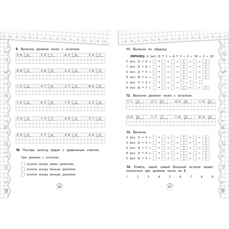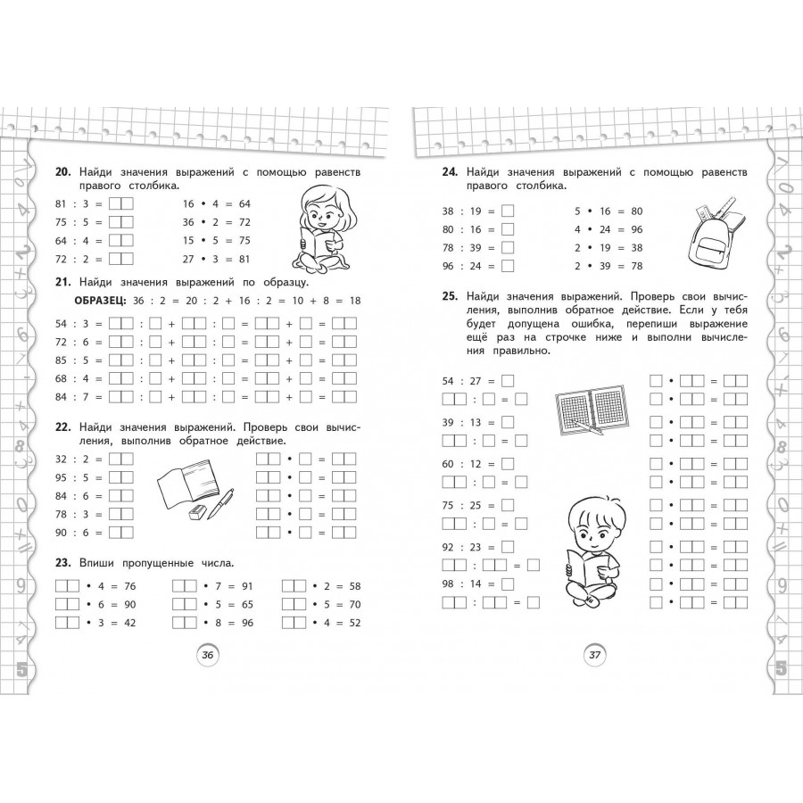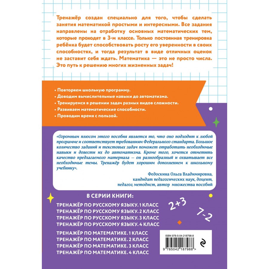 Пособие от издательства «Эксмо», соответствующее ФГОС, разработано специалистом с многолетним опытом работы и станет отличным помощником для учеников 3 класса в отработке умений и навыков, полученных на уроках математики. Решение большого количества примеров и задач на сложение и вычитание в пределах 1000, умножение и деление, деление с остатком, знакомство с долями даст возможность школьникам в дальнейшем избежать вычислительных ошибок и довести навыки счёта до автоматизма. Занимаясь по книге, учащиеся научатся анализировать информацию и понимать учебную задачу, а также смогут закрепить пройденный материал, восполнить пробелы в знаниях, развить математические способности, повысить успеваемость по предмету. Задания в тренажере построены таким образом, чтобы не повторять, а дополнять упражнения, которые предлагаются в школе. Благодаря этому его можно использовать в сочетании с любыми из существующих учебников по математике. Кроме того, в серию входят и пособия по русскому языку для 1, 2, 3 и 4 класса. Только постоянная практика позволит школьнику уверенно чувствовать себя на уроках и получать отличные оценки.